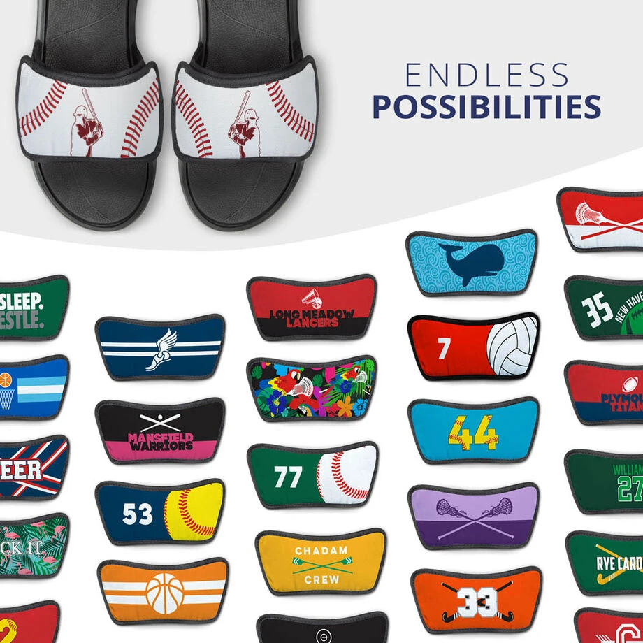 Show off that baseball pride everywhere you go with a pair of baseball Repwell® slide sandals and choose from the many interchangeable design straps. With the removable design straps you can mix and match different straps and represent different sports and designs all on one pair of sandals. With the endless possibilities for designs these Repwell® slide sandals and straps make for a great gift not just for a player but for the whole team.