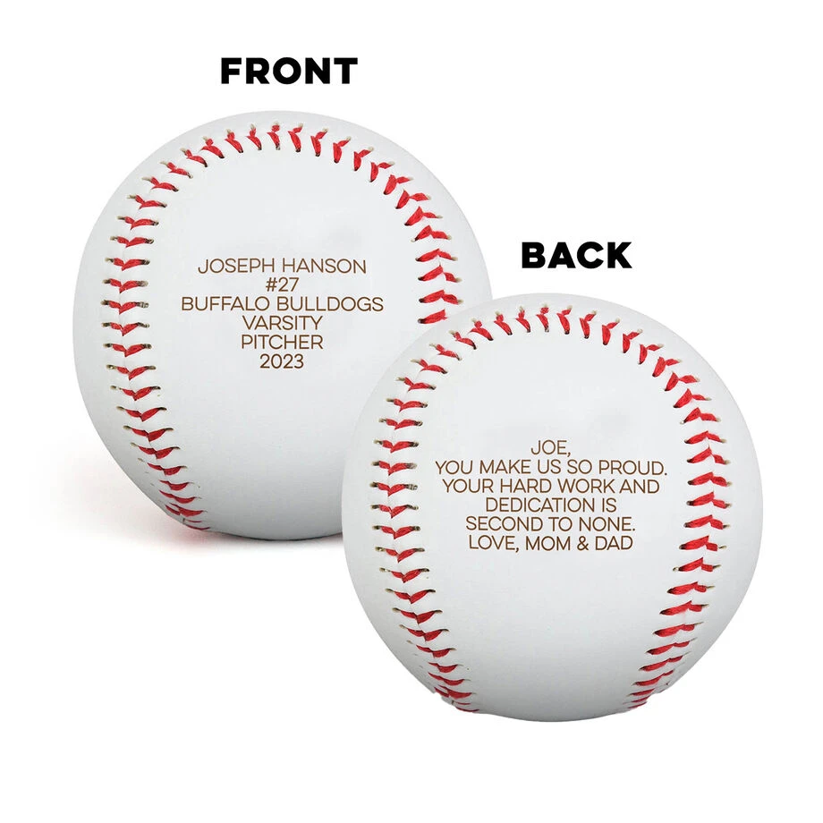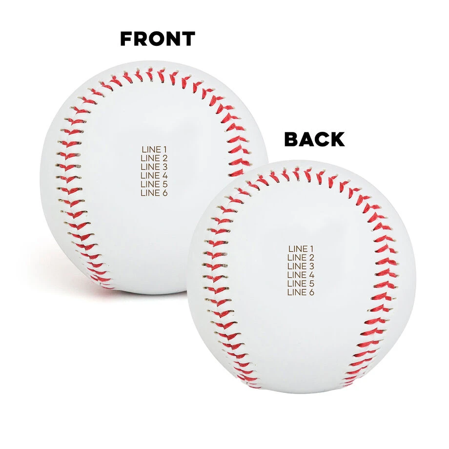 Our custom text engraved baseball allows you to commemorate a great season, deliver a special message, or create a one-of-a-kind design. Completely customize the text on both sides of the ball. On one side could be a favorite quote, significant date, or message and the other side could include a name, favorite phrase, and more! Create a thanks coach message from the team and present it at your end of season banquet. Whether it’s a gift for a loved one or a treat for yourself, this baseball is sure to be treasured for years to come.