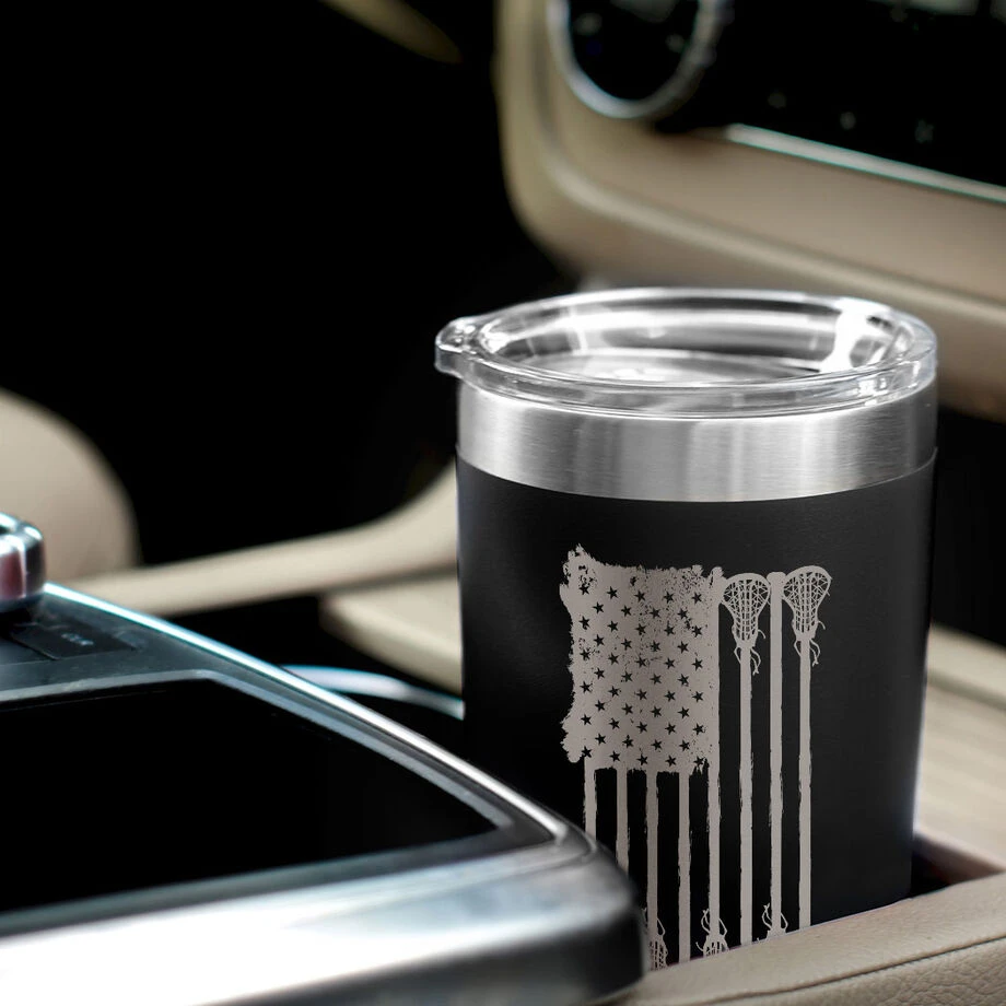 Our girls lacrosse travel tumbler is laser engraved with a patriotic lax flag and perfect for hot and cold beverages, making it a great gift for on-the-go lacrosse players. The stainless steel tumbler holds 20 oz. of liquid – hot or cold – and uses double-wall vacuum insulation to ensure the beverages stay as close to their intended temperatures as possible for an extended period of time. Perfect for road trips and away games, as well as checking out other teams’ games or anywhere you’re headed. This is a stylish and useful girls lacrosse gift for a player, coach, or the whole team, no matter the occasion – including the beginning and end of the season.