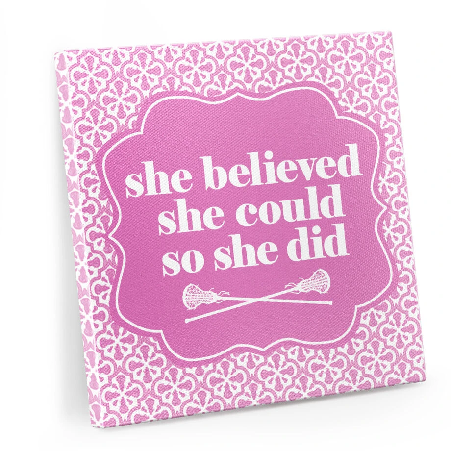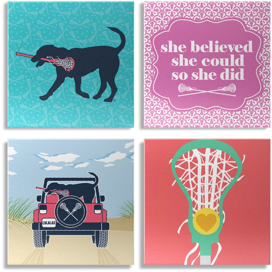Add a lacrosse accent to any room you decorate with our one-of-a-kind Lula the Lax Dog 4-piece canvas set. Each wall art measures 12″ X 12″ and features an exclusive design and artist-grade wrapped edges to complete the look. Bring your passion for the game to life with the texture and depth of this unique stretched canvas prints. Perfect to create a sports themed room and a thoughtful gift for any girls lacrosse player or fan. Hardware included for easy hanging.