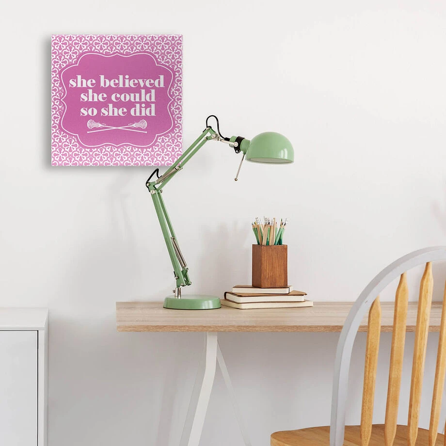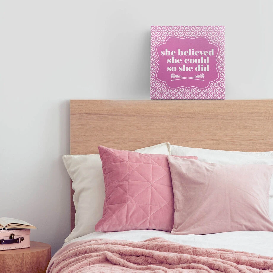 Add a lacrosse accent to any room you decorate with our one-of-a-kind She Believed She Could So She Did canvas. This 12″ X 12″ wall art features an exclusive design and artist-grade wrapped edges to complete the look. Bring your passion for the game to life with the texture and depth of this unique stretched canvas art. Perfect to create a sports themed room and a thoughtful gift for any girls lacrosse player or fan. Hardware included for easy hanging.