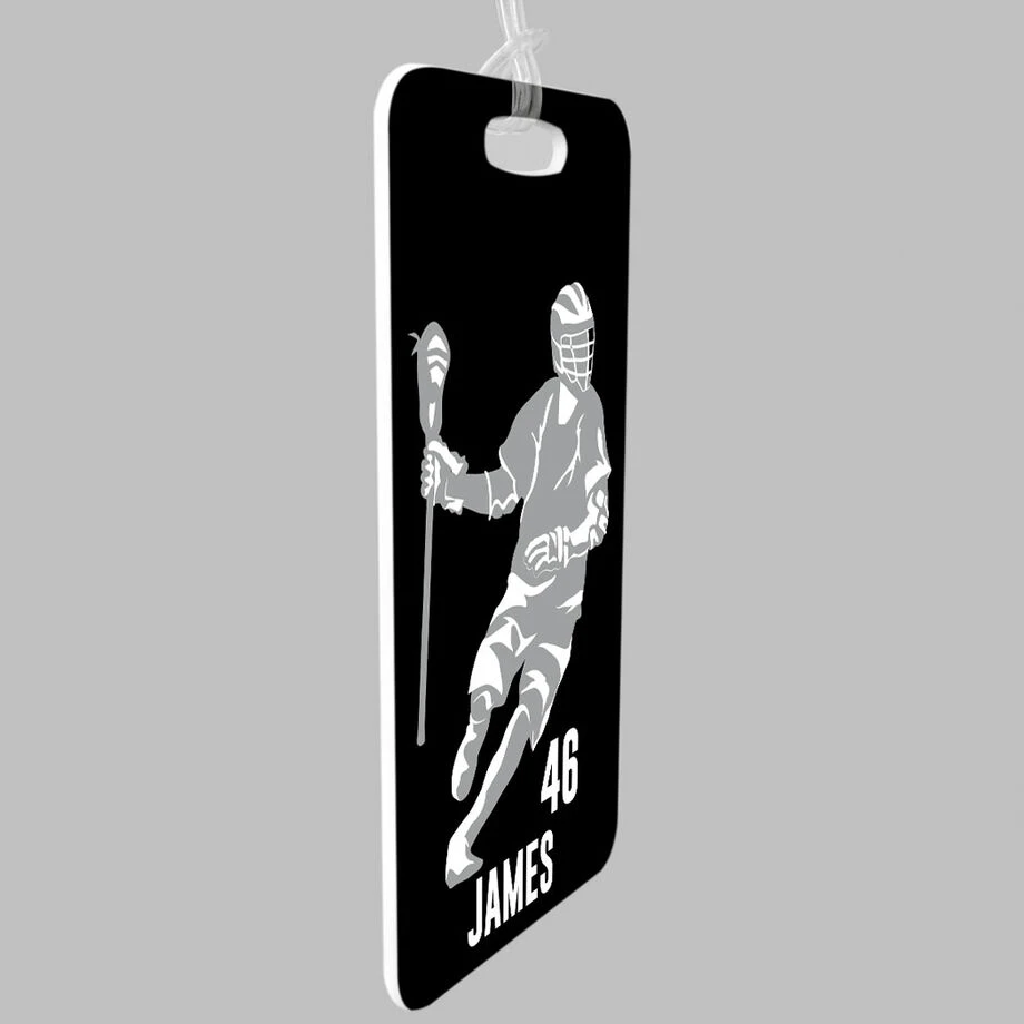 Add a custom name and number to our durable plastic guys lacrosse bag tag with room for personalized contact information on back for a great gift idea. The eye-catching and unique tag is an ideal way to quickly and easily find a bag anywhere a player may be, whether that’s traveling with the team and unloading the bus, a locker room or on the field, or anywhere he goes. Available in three different sizes, the tag attaches to any style of bag with a soft, clear plastic loop that stays in place for a great gift any proud player will love showing off – perfect for an individual player or the whole team.