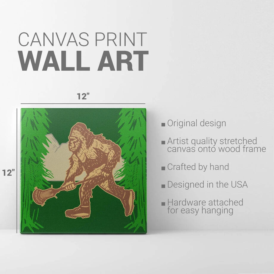 Add a lacrosse accent to any room you decorate with our one-of-a-kind Big Foot Lacrosse canvas. This 12″ X 12″ fine wall art features an exclusive design and artist-grade wrapped edges to complete the look. Bring your passion for the game to life with the texture and depth of this unique stretched canvas art. Perfect to create a sports themed room and a thoughtful gift for any lacrosse player or fan. Hardware included for easy hanging.