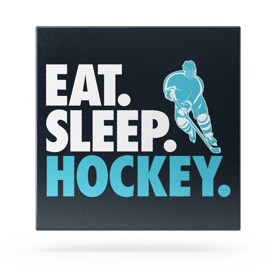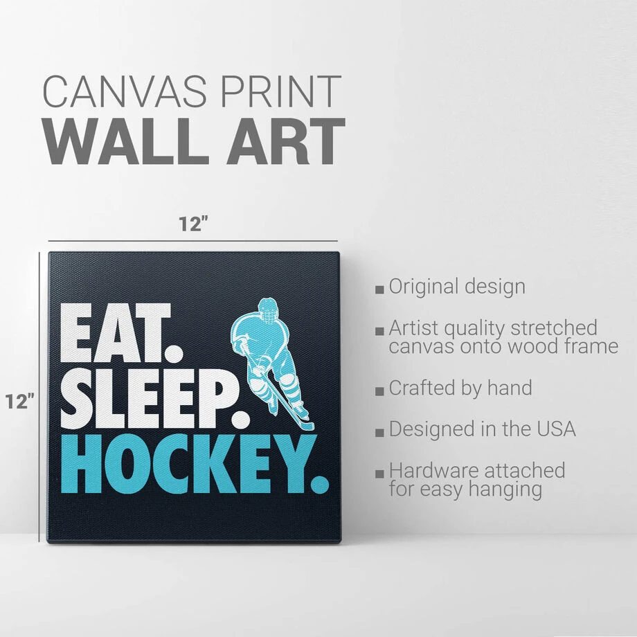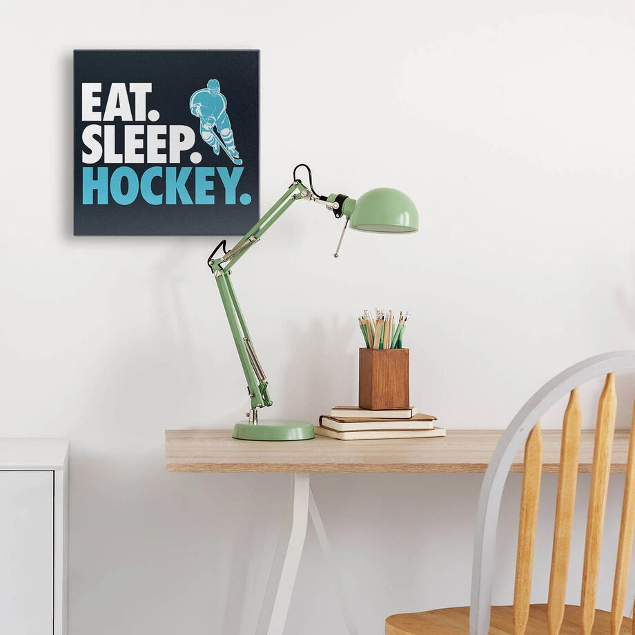 Add a hockey accent to any room you decorate with our one-of-a-kind Eat Sleep Hockey canvas. This 12″ X 12″ wall art features an exclusive design and artist-grade wrapped edges to complete the look. Bring your passion for the game to life with the texture and depth of this unique stretched canvas art. Perfect to create a sports themed room and a thoughtful gift for any hockey player or fan. Hardware included for easy hanging.