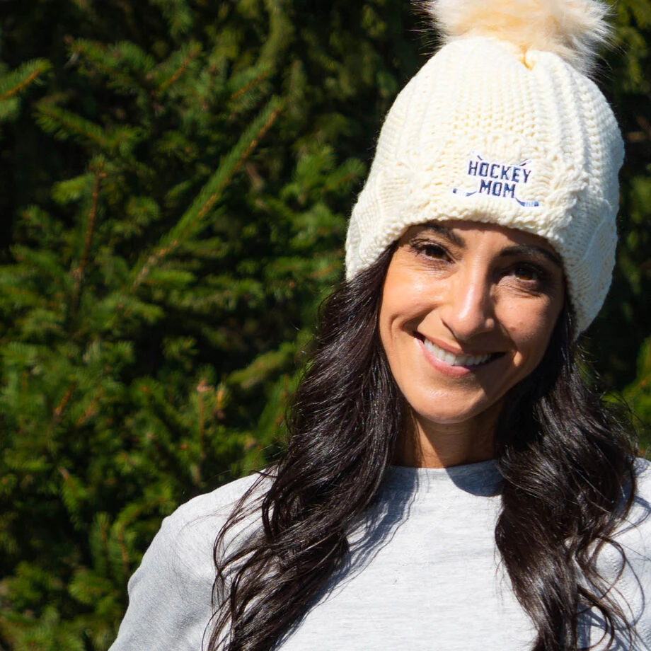This thick, fleece-lined Hockey Mom pom pom knit hat is great to throw on to help keep warm when cheering on your favorite hockey star at the rink. With an embroidered hockey mom design on its foldover cuff, you can proudly show off your support wherever you go. The fleece lining makes this hat soft and comfortable when wearing, and its large, faux fur pom pom is a fun accent to keep you stylish while staying toasty. This makes for a great gift idea for Mother’s Day, mom’s birthday or Christmas!