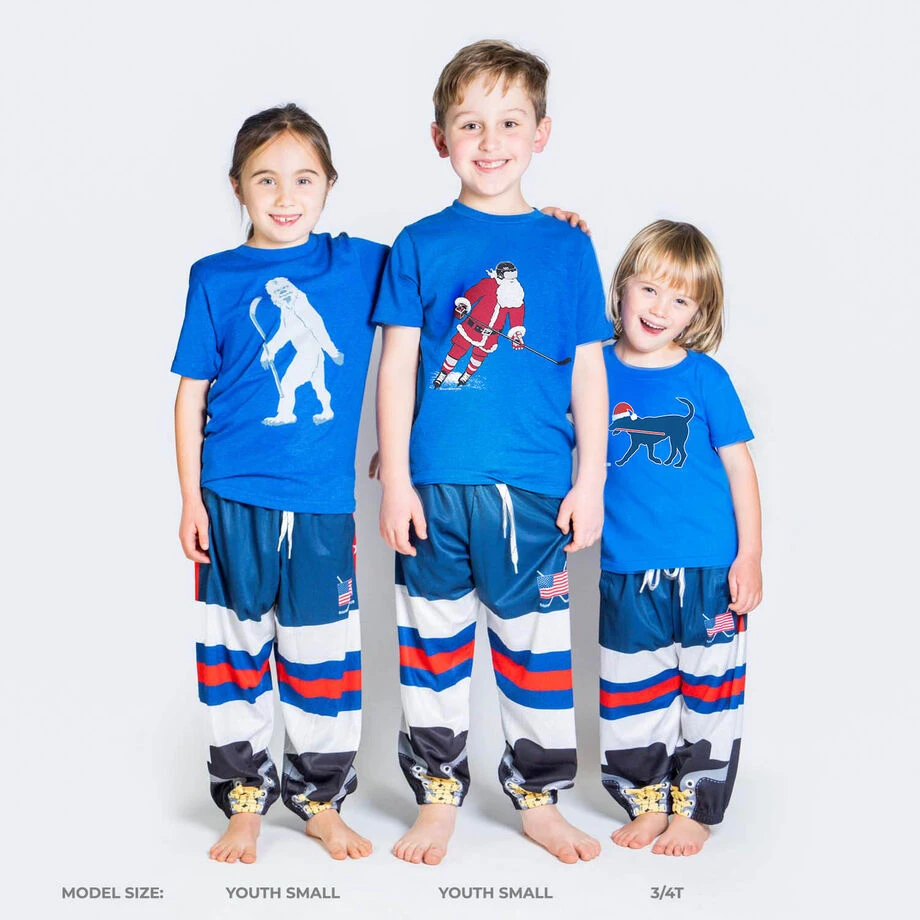 Get comfy in a pair of our hockey lounge pants with a fun player design, whether at home or the rink these lounge pants are sure to be a hit for all occasions. These lounge pants are made from 100% performance polyester, which makes them great to wear year round. Our lounge pants also feature a comfortable elastic waistband with a drawstring, along with side pockets and elastic ankles. A pair of these lounge pants make for a great gift for any occasion.