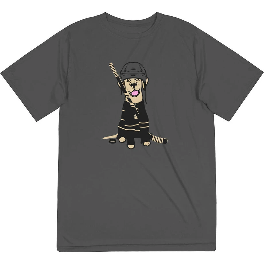 Gear up for the ice or any activity with our short sleeve tech tee with our Hunter the Hockey Dog design, this is the perfect tee to show off that hockey pride. This moisture-wicking short sleeve athletic tech tee is great way to keep you dry during all activities or daily wear. With UV protection it will be sure to protect your skin as well. This shirt also makes for a great gift for any occasion.