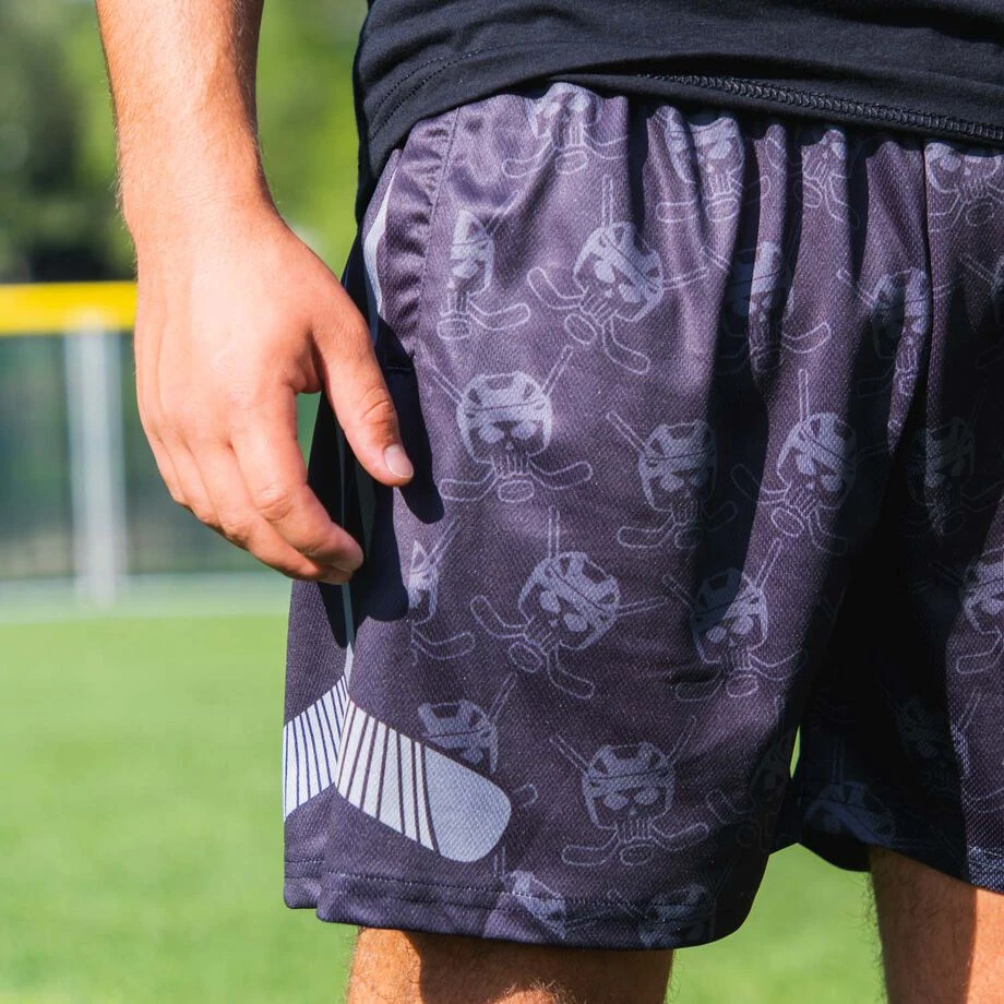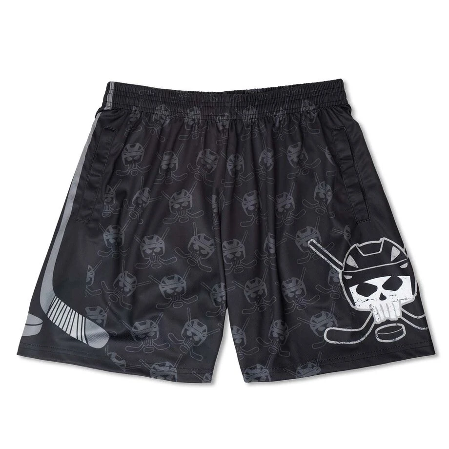 Rep your love of ice hockey in style with a pair of our one-of-a-kind Hockey Skulls shorts. These shorts are sure to be a favorite with any player to and from the rink. Our athletic shorts are ideal for year round wear – whether you are going to a game, practice, lounging or just daily wear. These lightweight, incredibly comfortable moisture-wicking shorts are also equipped with an elastic adjustable waistband and side pockets