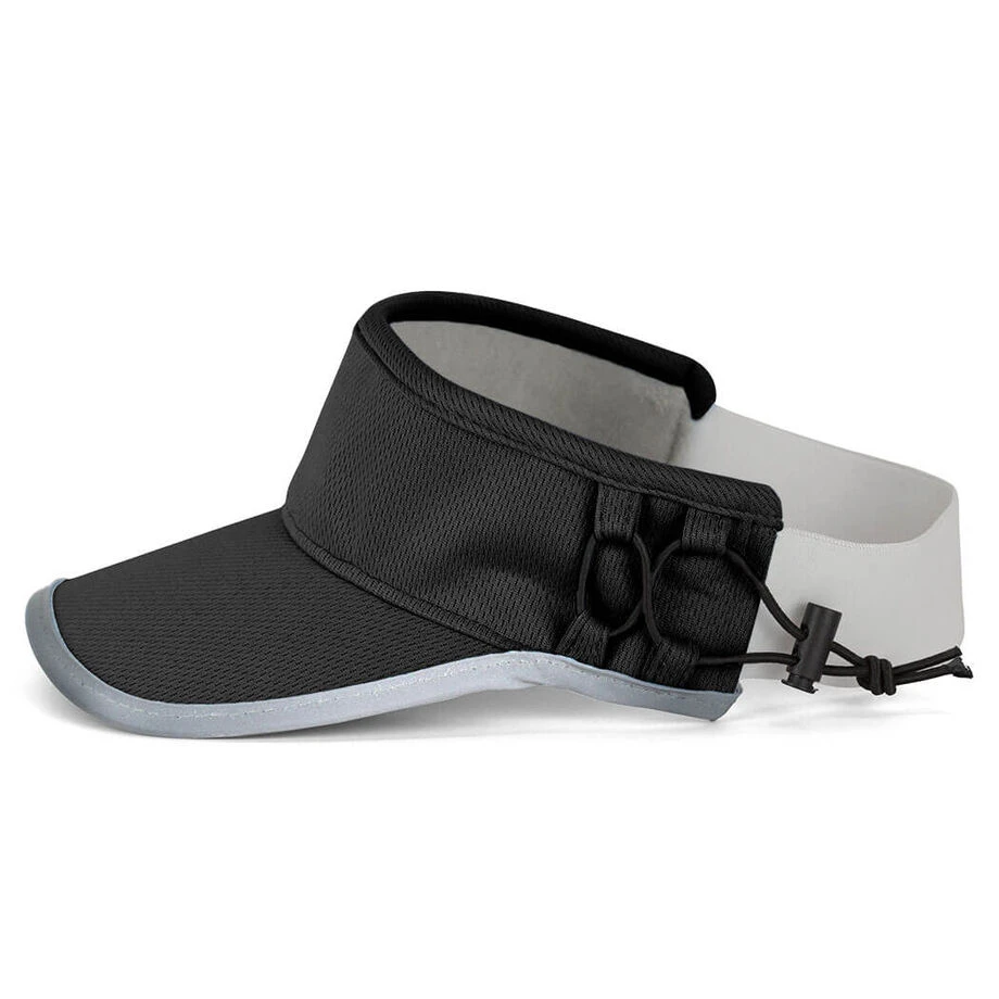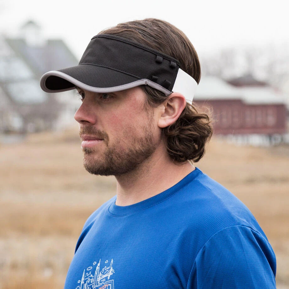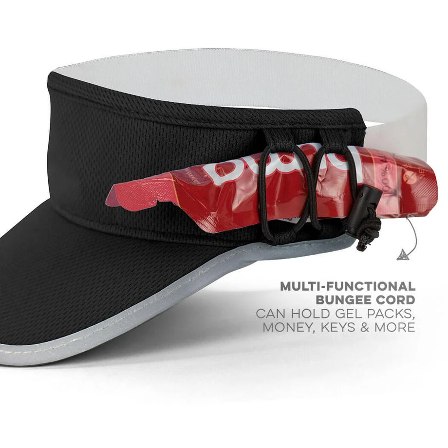 This RunTechnology® visor is a top performer for the athlete and outdoor enthusiast. This lightweight visor is designed for the athlete with its moisture wicking material, the super comfort elastic strap, reflective piping for safety and a proprietary bungee system for carrying athletes gel packs & essentials. The bungee is adjustable and can be removed easily if needed.