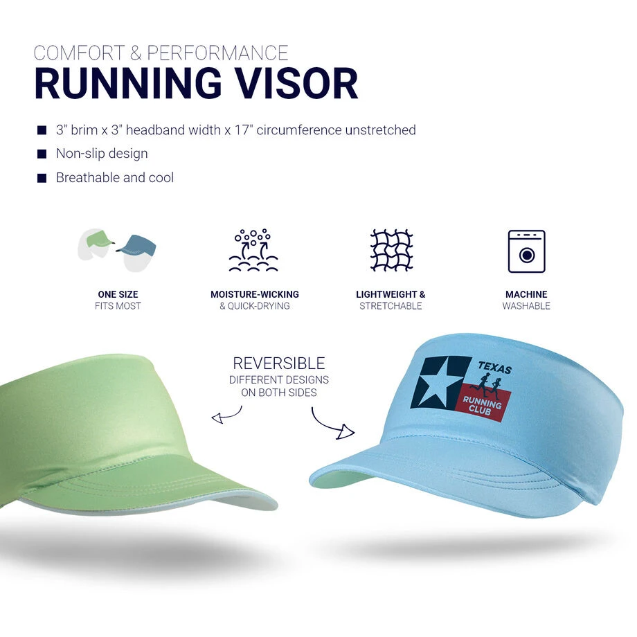 This running performance visor is fully customizable with your choice of logo. Whether it’s your running club or any other logo, show off your personalized visor on your runs and daily errands. Our lightweight visor features a wide brim and stretchable band for all-day comfort. The breathable and moisture-wicking material keeps you cool and dry during any activity. This foldable and packable visor is also reversible, offering your chosen logo printed on one side and a unique solid color on the other for more of a subtle look. Keep the sun, hair, and sweat off your face while showing off your runner pride in our customizable visor for runners and athletes.